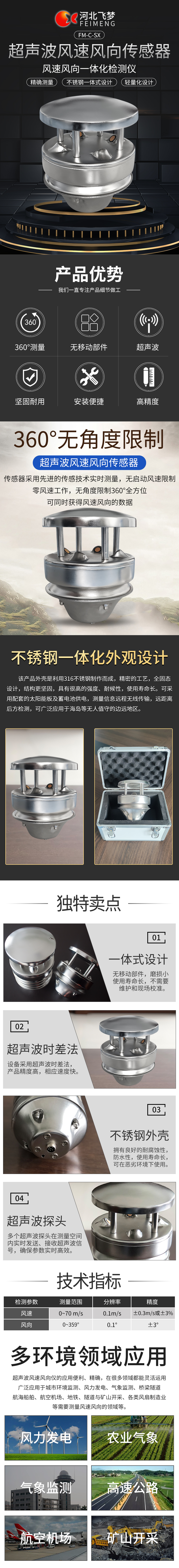 FM-C-SX型超聲波風速風向傳感器是利用超聲波時差法來實現(xiàn)風速風向的測量。測量精度高,性能可靠,攜帶方便,沒有任何移動部件,而且不需維護和現(xiàn)場校準,是一種較為先進的測量風速風向的儀器。
